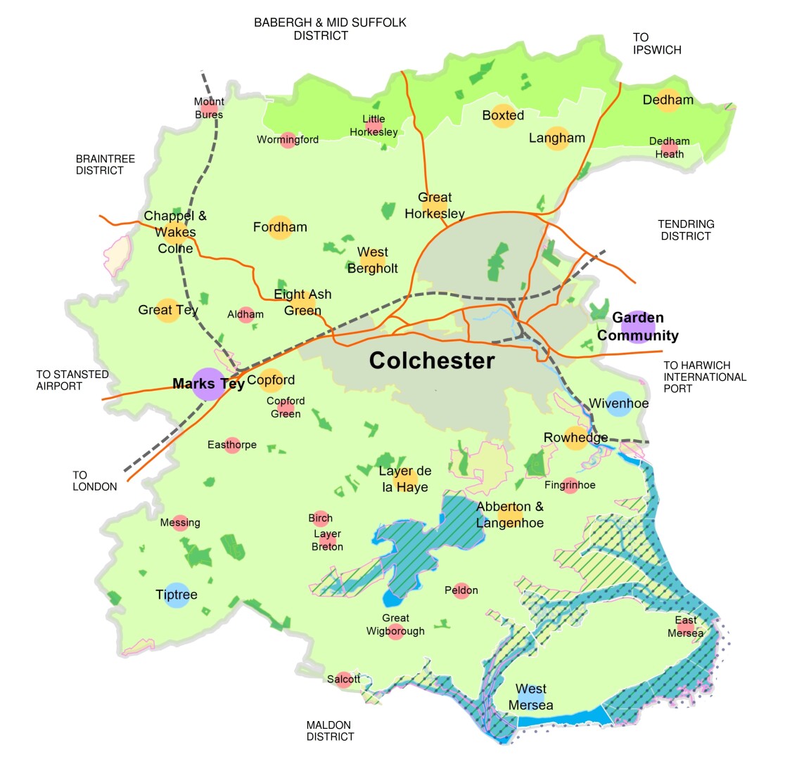 3.22 Key transport corridors across Colchester have also been identified for their function and connectivity and potential to support growth. The role of larger settlements outside of the urban area is also recognised. These larger settlements have the most facilities, services and opportunities. These settlements also have some of the largest populations of Colchester. As such, it is proposed to group, Tiptree, Wivenhoe and West Mersea as the next tier within the hierarchy as large settlements. Growth in these settlements not only reflects their size but also considers the opportunities and constraints that apply to each location.