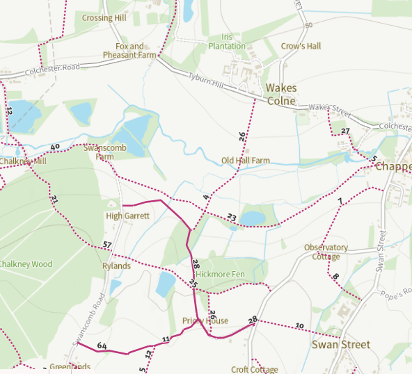 Semi-rural area with an equestrian community. Development is close to Restricted Byway 28 Chappel, Restricted Byway 11 Chappel and Restricted Byway 64 Great Tey and Chalkney Wood. PRoW must be designed as multi-user routes (MURs) to ensure inclusivity for all non-motorised users. MURs function as public highways and are best defined as restricted byways—open to pedestrians, horse riders, cyclists, and users of non-motorised vehicles—or as bridleways, which permit access for pedestrians, horse riders, and cyclists. Any new links should have the RB status to ensure consistent access for all users and inclusivity.